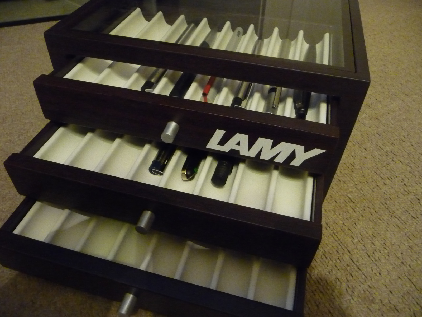 Hello Marc, funny you asked this question because every time I take out a pen, the thought crosses my mind that I better take the whole drawer out just so I don’t accidentally dropping the entire drawer onto the floor. I was used to just flipping open the glass of my old pen box.
